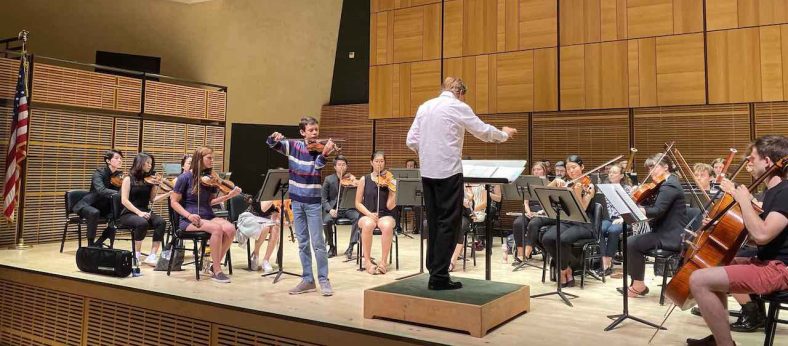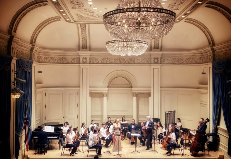 Dress rehearsal of the concert "Vocal and Instrumental Music at Carnegie Hall" at Zankel Hall at Carnegie Hall, NYC. On the photo: Conductor Kurt Schmid, orchestra Symphony in C, and violinist Almos Quevedo. Click to learn more