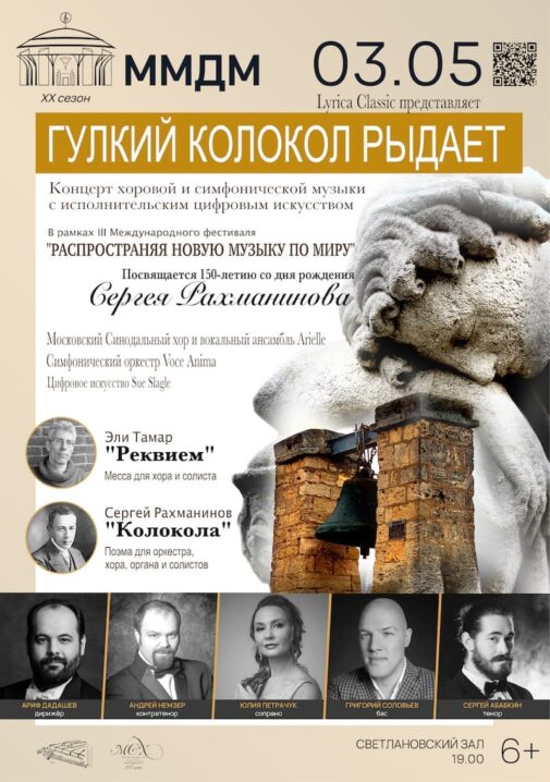 В программу фестивального концерта войдут два масштабных хоровых произведения – «Реквием» современного американо-израильского композитора Эли Тамара и поэма для солистов, хора и оркестра «Колокола» русско-американского композитора Сергея Рахманинова в исполнении Московского Синодального хора, вокального ансамбля Arielle и оркестра Voce Anima под руководством ведущего дирижёра Музыкального театра им. Станиславского Арифа Дадашева, а также ведущих солистов мировой музыкальной сцены: